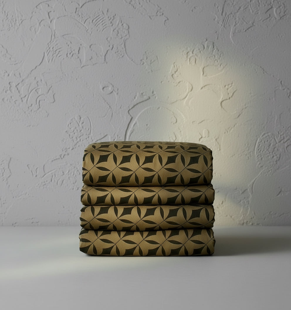 The Mondo Gold satin bedding set brings a warm, radiant presence to the bedroom. Its smooth cotton satin surface highlights the subtle golden tones, while the refined geometric design adds structure and an elevated contemporary feel.